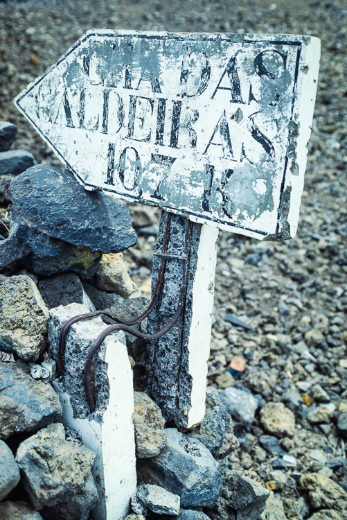 Wir steigen aus und erklimmen die Hügel neben der Strasse. Weitläufig herrscht eine grosse Unordnung. Neben zentimeterhoher Asche liegen winzige und riesige Gesteinsbrocken weit verstreut, Zeichen des letzten Ausbruchs. An der Flanke des Pico de Fogo rauchen zwei Aschenkegel: der Ort der letzten Eruption. Leicht erhöht, ist von unserem Hügel der Fluss der zerstörerischen Lava zu verfolgen.