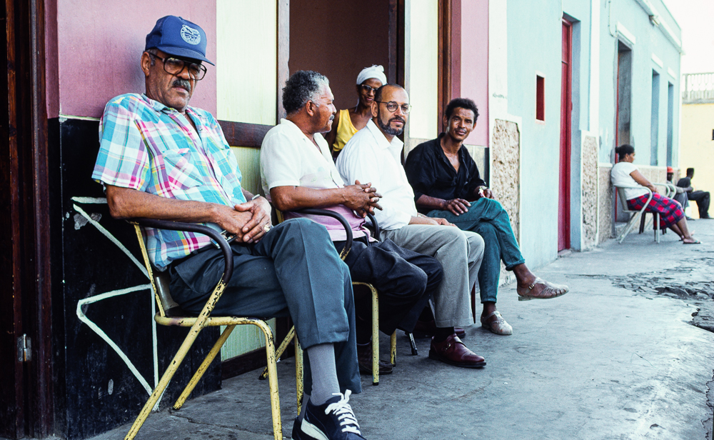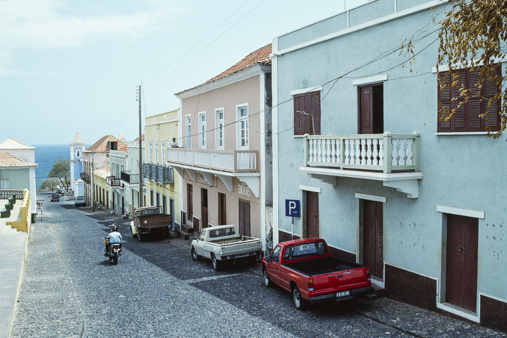 Von der Pensao Vulkao blicken wir über sanft zum Meer hin abfallende ziegelrote Dächer, aus denen sich die blauen Doppeltürme der kleinen Dorfkirche erheben. Im Überblick sieht der Ort sehr grosszügig angelegt aus. Ein erster Spaziergang bestätigt diesen Eindruck. Die Atmosphäre wird bestimmt vom Zusammenspiel der farbenprächtigen Kolonialbauten, welche die weit angelegten Plätze umringen, und schmalen Gassen und eleganten Treppen, über die man eins ums andere Mal auf eine neue Ebene steigt , die immer wieder einen unvergesslichen Panoramablick über den Atlantik und auf die Nachbarinsel Brava erlaubt. Die Dimensionen mancher Plätze wirken eigentlich übertrieben gross, doch machen sie die Faszination dieses Ortes aus und sind zudem hervorragende Bühnen für das Schauspiel des öffentlichen Lebens. Besonders abends, wenn das grelle Sonnenlicht zu einem rötlichen Schimmer abgedämpft ist, bietet sich der stimmungsvollste Ausblick. Ausserdem sollte man sich schnell um gute Plätze sorgen, denn jetzt beginnen die Aufführungen um junge und alte Liebe, Freud und Leid, dessen Dramaturg das harte Leben ist.