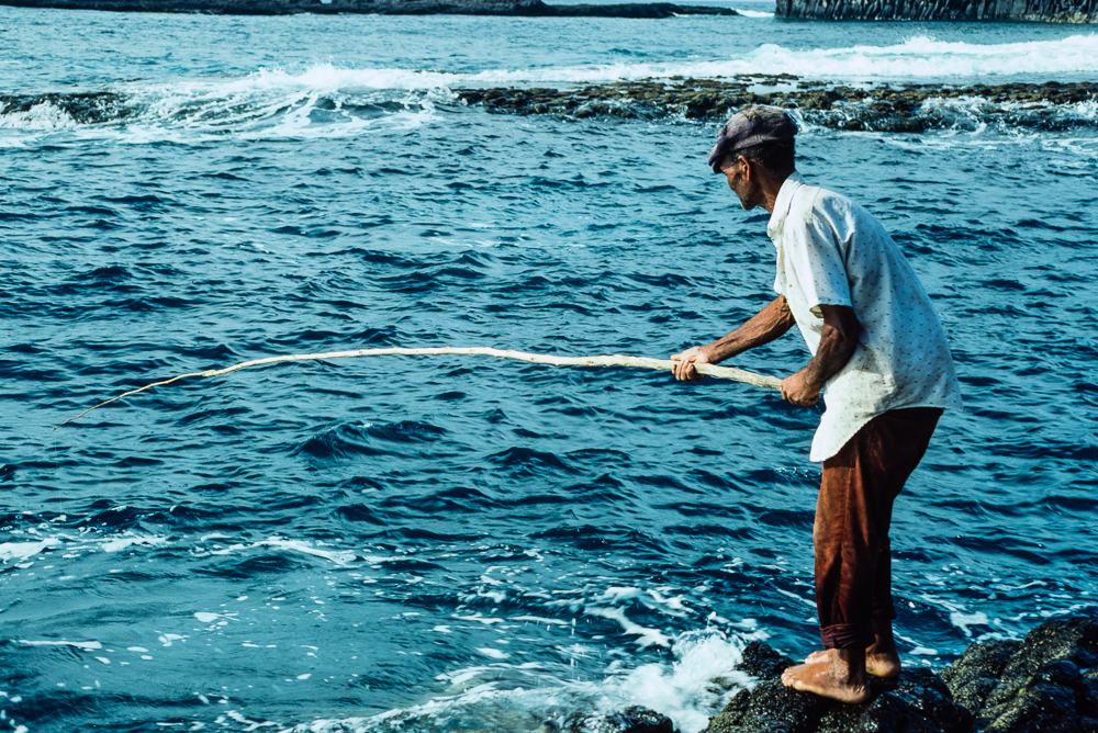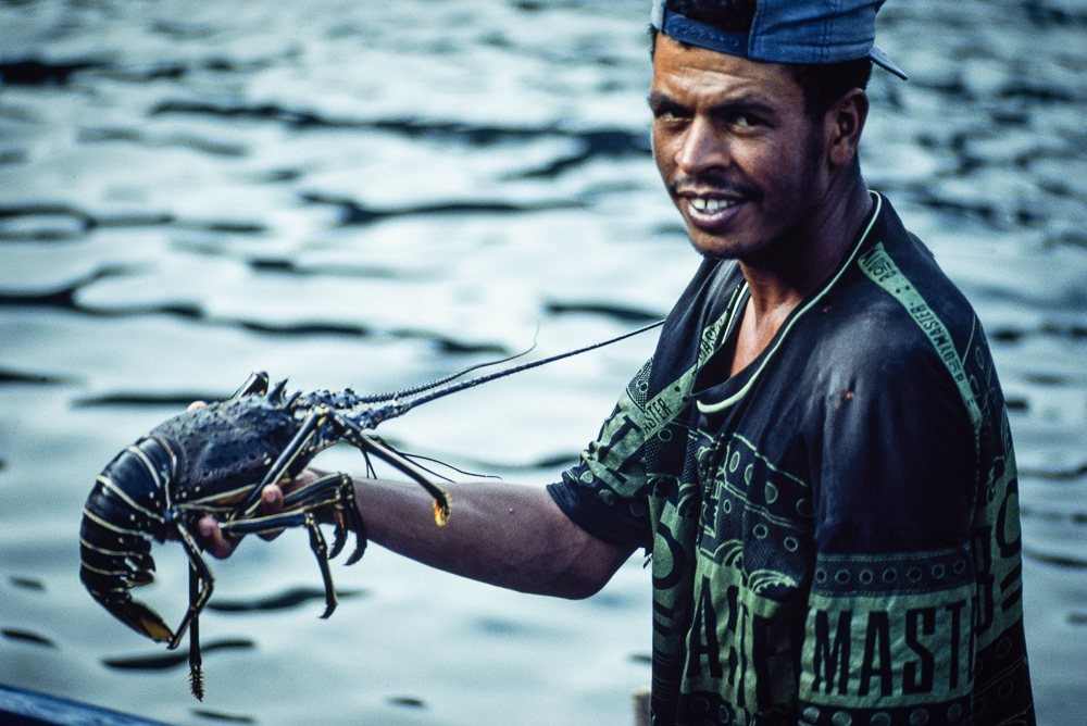 In dieser zerklüftete Küstenregion schlagen wir unser Lager auf. Von den Dörfern hoch droben kommen Fischer mit einfachen Holzruten herabgewandert, um den Speiseplan mit einem Fang aus dem reichhaltigen Meer zu vergrössern. Ein Ruderboot, das einem Taucher folgt erweckt zusätzlich unser Interesse. Nachdem sie auf unsere kleine Bucht zusteuern, laufen wir hinüber zu dem kleinen Naturhafen, wo weitere Boten in „Garagen“ aus Bananblättern ruhen. Stolz präsentieren sie nun ihren Fang: Langusten.