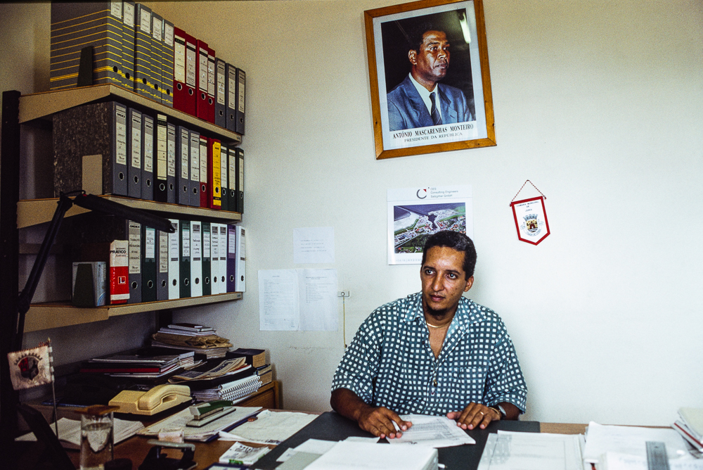 Ein weiterer, aber unverhoffter Höhepunkt, ergab sich tags darauf, als ich das Büro für die Kapverdische Koordination mit der Deutschen Gesellschaft für Technische Zusammenarbeit besuchte. Anstoss zu diesem Besuch gab ein Schulfilm, den ich kurz vor unserer Abreise gesehen hatte. Dieser Film war die einzigste Informationsquelle über Fogo, die ich erhalten konnte und zeigte Aufforstungs-, Bau- und Bewässerungsprojekte, kommentiert von einem deutschsprechenden kapverdischen Projektleiter. Ein zweiter Grund war vielleicht auch, etwas über den Verbleib deutscher Steuergelder zu erfahren. Freudig überrascht erblickte ich ein bekanntes Gesicht, nachdem ich um ein Treffen mit dem Direktor gebeten hatte. Rui Evora, der Projektleiter, war inzwischen Leiter des Büros der Region Fogo / Brava. „Guten Tag, was kann ich für Sie tun“, werde ich in perfektem Deutsch begrüsst. Ich erkläre ihm meine Absicht, etwas über die Entwicklungshilfe auf Fogo zu erfahren und erwähne den Film, worauf er schmunzelnd kurz in Erinnerung versinkt: „Ist ja schon lange her, 10 Jahre sind inzwischen vergangen und viel hat sich geändert, wie Sie sehen !“ Sogleich erzählt er mir von sich und seiner Arbeit. Seine hervorragenden Deutschkenntnisse hatte er sich beim Studium für Wassertechnik in Magdeburg zu DDR-Zeiten erworben. Nun leitet er die 6. Dreijahresperiode der Zusammenarbeit mit der Bundesrepublik Deutschland ein, in der sich der Charakter der Hilfe ändern würde.