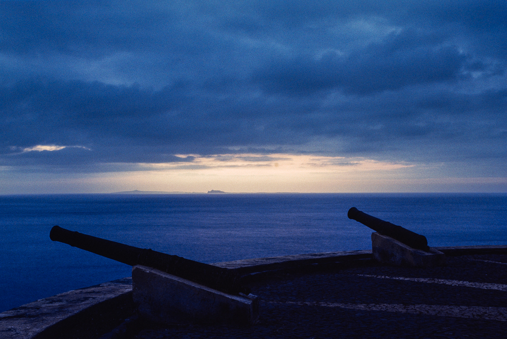 Zuerst tauchen die unbewohnten Ilhas Secas Ou du Rombo auf, weil sich der Pico noch in einen Morgenmantel aus Dunst und Wolken hüllt. Doch nach und nach treten die schwarzen Steilküsten der Vulkaninsel immer deutlicher hervor. Fogo, wie auch die Nachbarinsel Brava können viel weniger sicherer Häfen bieten, auch wenn durch Aufschüttungen und eine inzwischen halb zerstörte Mole das Anlanden erleichtert werden soll. Nach zwölfstündiger Fahrt macht unser Schiff vor der Felsküste fest.
