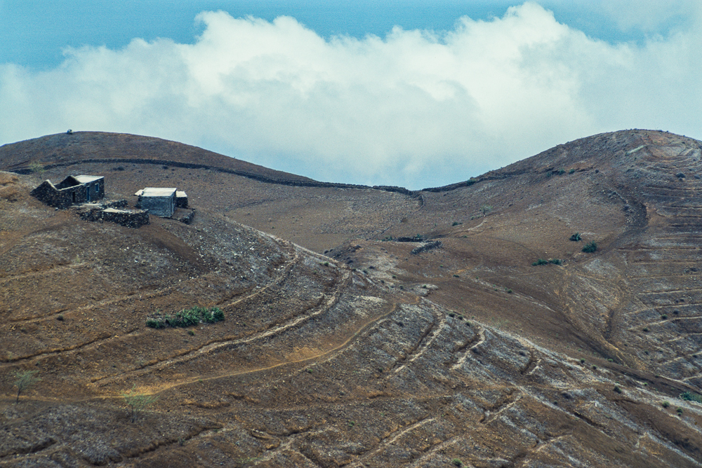 Fogos vernarbte Landschaft hat viele Gesichter. Im Nordwesten ziehen sich steile Hänge 2.000 m hinauf zum Rand der Caldera, dem alten Einsturzkrater des Ausbruchs vor fast 500 Jahren. Die Felsen stecken oft in feuchtigkeitsschwangeren Passatwolken. Jeder Flecken der schwarzen Erde wird als Agrarfläche genutzt, weit verstreut blinken Dörfer und Bauernhäuser von den Bergrücken. Satt grüne Pflanzen überziehen die schwarze Erde, die einen schweren Duft verströmt. Die Aussicht wirkt sich wohltuend und beruhigend auf das Auge aus. Im obligatorischen Sammeltaxi fahren wir vorbei an strohgedeckten Hütten. Auf der Hauptstrasse, auf der wir fast schon die halbe Insel umrundet haben, treiben Kinder Gruppen von Eseln zu den Zisternen und Brunnen, um ihnen mit Wasser gefüllte Autoschläuche überzuhängen. In Ponta das Salinas lassen wir uns absetzen. Hier hat ein ehemaliger Lavastrom im Meer bizarre Felsformationen hinterlassen.