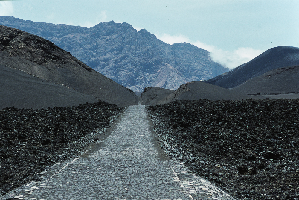 Urplötzlich lüftet sich der Schleier in dem Augenblick, als wir in das schwarze Chaos von Tuffstein, Block- und Stricklava des alten Einsturzkraters einbiegen. Zu unserer Linken ragt die halbrunde Wand des alten Kraters bis 800 m empor, zur Rechten aber erhebt sich gewaltig das Gipfeldreieck des Pico de Fogo vor tiefblauem Himmel. Wolkenfetzen fliessen über die scharfgezogenen Kanten der Aschenhänge. Solch einen imposanten Auftritt hat sich dieser Berg wahrlich verdient. Mit welcher Selbsteinschätzung wagt der Mensch, sich in dieser surrealen Atmosphäre mit den Kräften der Erde zu messen. Nach einigen Fahrminuten haben wir die Niederlage der Strassenbauer vor Augen. Meterhohe Schutthügel haben die Strasse unter sich begraben.