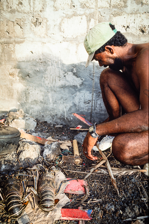 Manuel, aus dem nahen Ort Sao Jorge erzählt:“Wir essen die Langusten selber eigentlich nicht, meine Söhne z.B. mögen sie nicht einmal. Es wäre auch ein Luxus, denn für diese Tiere bekommen wir auf dem Markt in Sao Filipe viel Geld, bei Euch in Europa sind sie als Spezialitäten hoch begehrt“. Sogleich präsentiert er uns ein gewaltiges Exemplar, das zwischen 1-2 kg wiegen dürfte. Bislang haben wir uns mit dem Verzehr einer Languste zurückgehalten, doch hier fragen wir, ob sie uns welche verkaufen. „Habt ihr auch eine Ahnung, wie man sie richtig zubereitet und auseinandernimmt, was überhaupt essbar ist und was nicht ?“ gibt Manuel gleich noch zu bedenken. Auf unser Kopfschütteln lacht er kräftig und bietet seine Hilfe an.