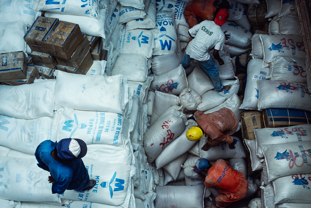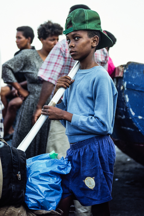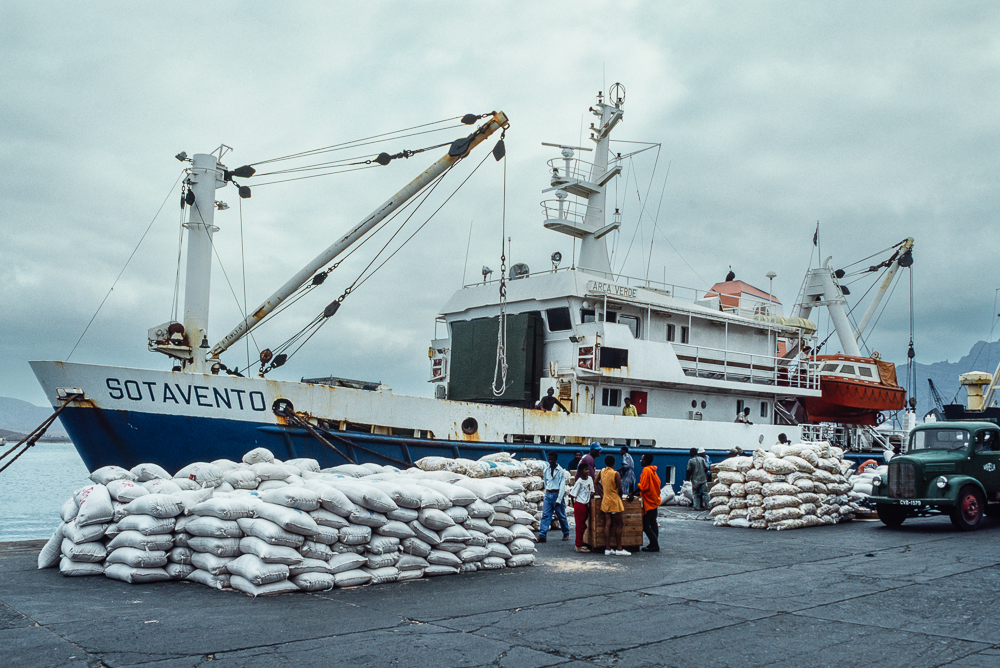 Das Schiff ist übrigens zusammen mit dem Schwesterschiff „Barlavento“ 1987 als Entwicklungshilfe in Emden gebaut und ein wichtiger Beitrag zur Verbesserung des Verkehrs zwischen den Inseln an die Republik übergeben worden. Die beiden Schiffe waren die wichtigste und billigste Fracht- und Reiseverbindung für die Einwohner, für die das bequeme Fliegen meist unerschwinglich bleibt. Und trotzdem gibt es viele KapverdierInnen, die ihre Insel noch nie verlassen haben. Die wartenden Passagiere stehen mit Kindern und Kleinvieh, Kisten und Koffern am Kai und üben sich in Geduld, denn nur langsam verschwindet eine Ladung Säcke im Bauch des Schiffes, unterbrochen von langwierigen, hitzigen Diskussionen um die Reihenfolge des Ladeguts. Immer weiter bringen Laster von der nahegelegenen Mühle Mehlsäcke, die von Hand auf das Kai gelagert und von dort mit dem Kran auf das Schiff gehievt werden. Bei dem gemächlichen Arbeitstempo wird es letztendlich Mitternacht, bis sich die Stahlluke im Bug über dem Laderaum schliesst.