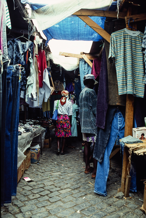 Wir entfliehen dem Geflecht der geschäftstüchtigen Händler und steigen über Treppen hinauf zur Oberstadt. Über kurz oder lang stösst man auf den grossen Lebensmittelmarkt, der den hungrigen Magen der Stadt füttert. Inmitten von Säcken voller Mais und Bohnen sitzen die Frauen und verscheuchen jene Gäste, die nicht kaufen und nur kosten: unvermeidliche Fliegen. Das Angebot ist gross, in einer Reihe gibt es die ganze Palette tropischer Früchte, in einer anderen Süsskartoffeln, Manjok, Aubergingen, Gurken und andere Gemüse. Trotzdem täuscht das Bild, denn wir wissen, dass 85 % aller Nahrungsmittel eingeführt werden, vor allem aus USA und der europäischen Union.