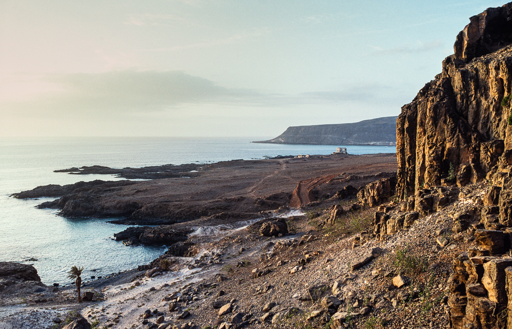 Dem Sand verdankt die Insel aber auch die schönen Strände. So auch den kilometerlangen Praja de Chave, den wir direkt von Sal Rei aus zu Fuss entlangspazieren, ohne einem Menschen zu begegnen. Der weisse Sand verläuft hier sanft in die von einer vorgelagerten Insel gegen die Brandung geschützten Bucht und bildet so einen ausgezeichneten Badeplatz. Im Inselinnern erheben sich karge Basalthügel über die flimmernden Luftschichten der Dünenlandschaften und Geröllwüsten. Die Sonne sticht aggressiver vom Zenit, und keinerlei Schatten gewähren Schutz, so dass man sich mit Hut, langer Kleidung und Sonnencreme wehren muss. Nie wölbt sich ein azublauer Himmel über der Insel, denn Staubschleier überdecken zum einen das Land, zum anderen erstrahlt die Luft in gleissender Transparenz. Später ziehen sogar Wolken auf, die aber keine Hoffnung auf Regen bringen, zu dünn ist ihr grauer Schleier.