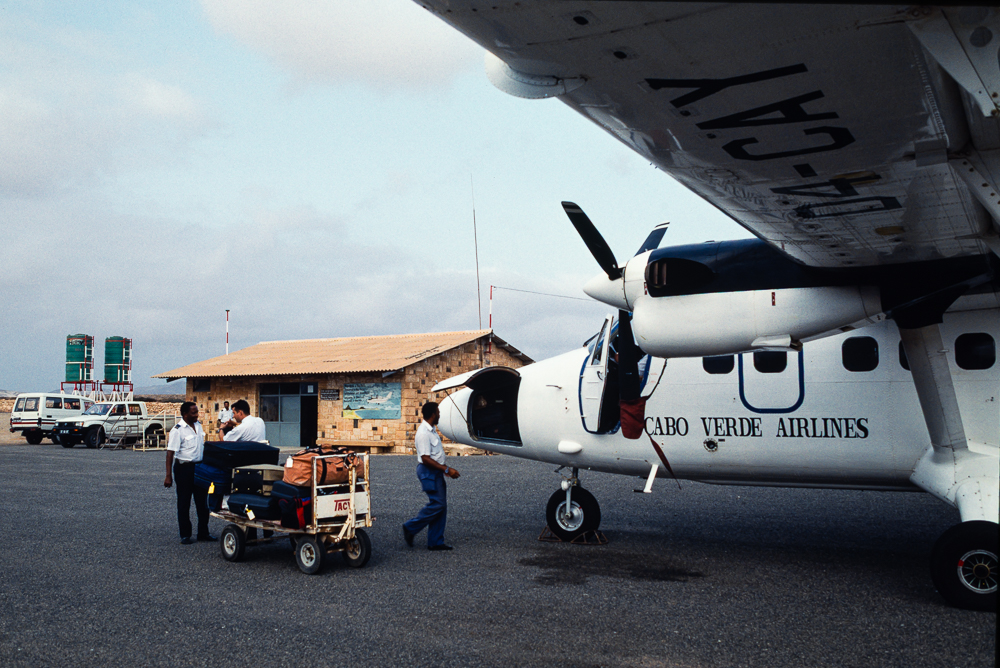 Nachdem wir Praia verlassen haben, beobachten wir von der ersten Reihe aus den Piloten, wie er nach 40 Minuten Flugzeit die zwanzig-sitzige Twin Otter auf Boavista aufsetzt und vor das einige Gebäude an der Piste rollt. Verglichen mit dem atemberaubenden Anflug auf Fogo, wo die kurze Schotterpiste neben der Steilküste verläuft ist die Landung auf Boavista unspektakulär, wenn auch nicht ohne landschaftlichen Reiz.