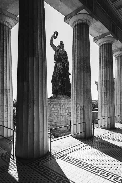 Bei meinen Ausflügen nach München besuchte ich eine weitere Sehenswürdigkeit der Stadt: die Statue der Bavaria vor der Ruhmeshalle an der Theresienwiese. König Ludwig I. wollte mit dem Bau Mitte des 19. Jahrhunderts eine sebstbewusste Selbstdarstellung der „Stämme“ Bayerns vermitteln und ein Denkmal für berühmte Persönlichkeiten aus Bayern schaffen. Nach einem Architekturwettbewerb im Jahr 1833 wurde der Entwurf von Leo von Klenze, ein Ensemble aus klassizistischer Säulenhalle und romantischer, germanisierten Statue, von 1843 bis 1850 umgesetzt.