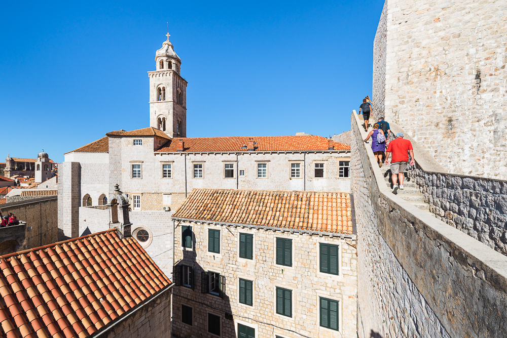 Der Einstieg erfolgt in der Nähe des östlichen Ploce-Stadttors. Dort hatte ich zuerst einen Blick nach draußen über die vorgelagerte Revelin-Festung. Innerhalb der Mauer dominiert an dieser Stelle das Gebäudeensemble des Dominikanerklosters aus dem 13.Jahhundert.