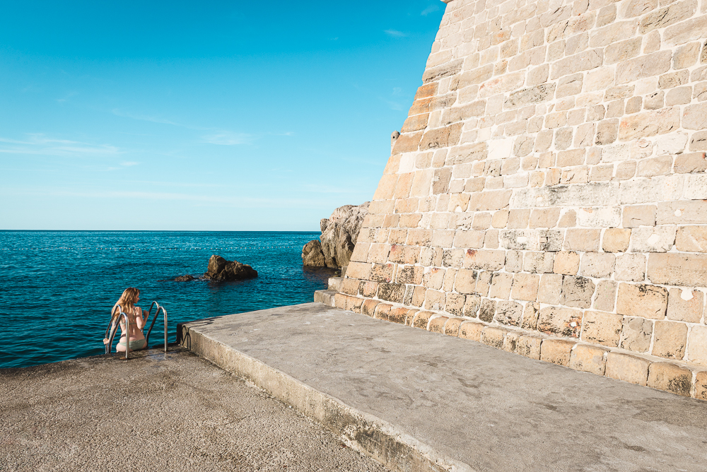 Ich folgte der Kaimauer und die Sv.Ivan Festung herum und erreichte schliesslich einen weiterern Badeplatz, direkt unterhalb der hochaufragenden Wehrmauern. Die hellen Steine reflektierten das grelle Sonnenlicht und sorgten durch die zusätzliche Einstrahlung schon früh am Morgen für eine ordentliche Wärme.