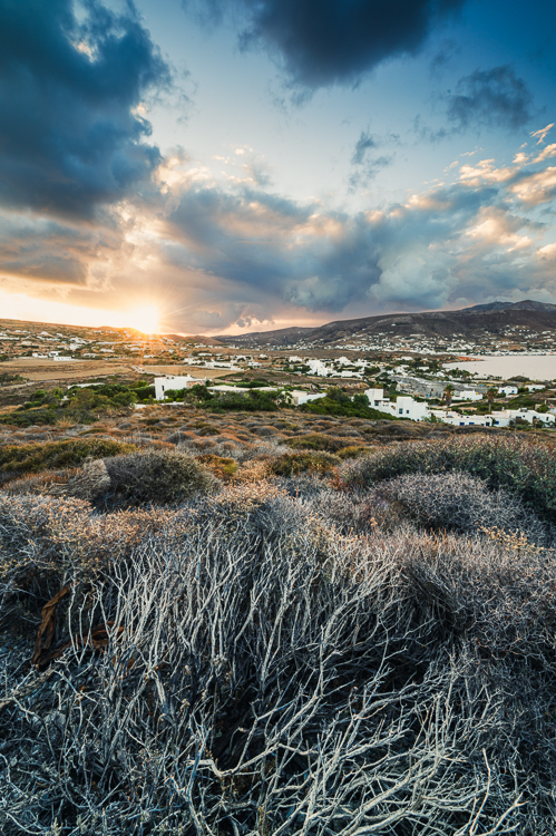 Ich hatte es an diesem Morgen geschafft, rechtzeitig aufzustehen und mit Stativ, Grauverlaufsfiltern und Weitwinkel-Objektiv loszuziehen. Die dornigen Büsche oberhalb der Siedlung von Krotiri sollten einen guten Vordergrund abgeben. Sie wurden dabei auch Ursache für einige schmerzhafte Stiche; die letzten Dornen habe ich mir übrigens erst zwei Wochen nach der Reise aus der Haut entfernt.