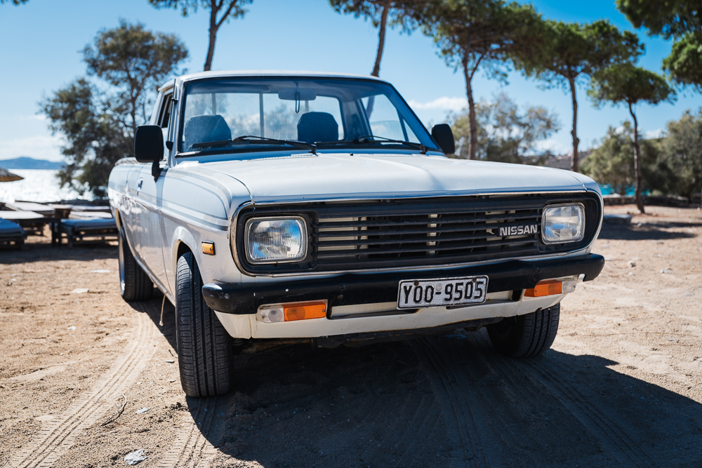 Am Strand von Krios saßen wir entspannt zum Mittagessen in Pedros Bar im Schatten der Bäume. Davor rollten sanft die Wellen auf den flachen Sandstrand. Wer Lust hatte, ging für ein Bad ins Meer. Auf dem Parkplatz erblickte ich einen älteren, aber sehr gut erhaltenen weissen Nissan Pickup, der meine Interesse auf sich zog – ich hatte schon immer ein Faible für Young- und Oldtimer.