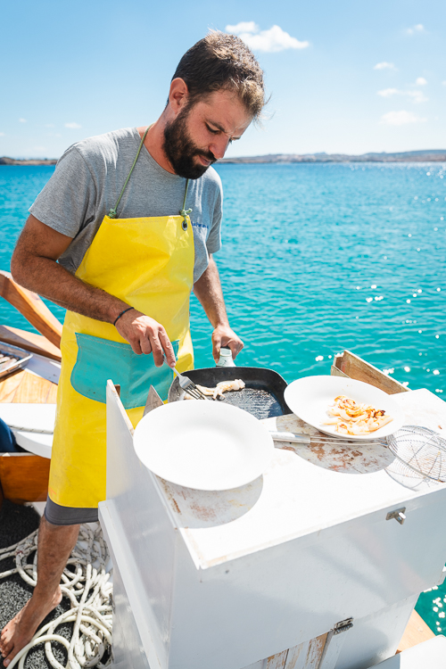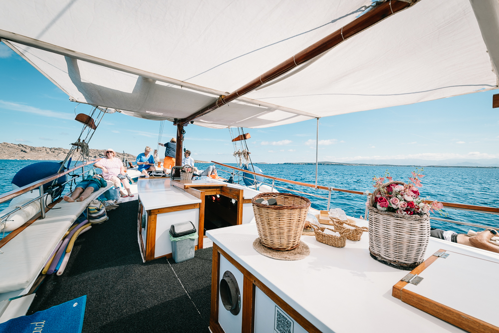 Während des Ausflugs wurden Getränke und frisch zubereitete griechische Leckereien auf dem Boot serviert – neben Wasser und Säften auch gekühltes Bier, Rot- und Weisswein. Wir erhielten ein vollständiges Menü mit griechischen Snacks wie gefüllten Weinblättern, Oliven, Käse oder Brot sowie später gegrilltem Fisch mit Beilagen. So konnten wir den Tag entspannt mit viel Komfort an Bord geniessen. Zwischen den Stopps liessen wir die leichte Brise, das Schaukeln des Bootes und den Geschmack von Sonne und Meer auf uns wirken – Momente voller Ruhe, Freiheit und Genuss.
