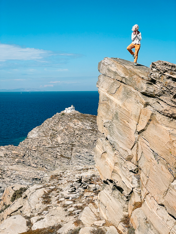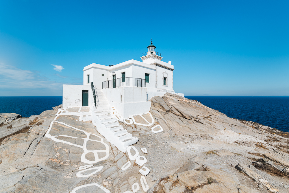 Das Gebäude des weiss getünchten, ehemaligen Leuchtturms strahlt gleissend hell vor einem tiefblauen Meer in der Mittagssonne. Dahinter erstreckt sich eine atemberaubende Rundumsicht auf die nördliche Ägäis und nahe gelegene Inseln wie Mykonos, Delos, Tinos und Naxos.