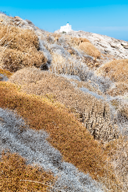 Zwischen den Felsen der Halbinsel findet man als Vegetationsform die sogenannte Phrygana vor. Das ist die Bezeichnung für die von niedrigem Busch- und Strauchwerk geprägte Pflanzenwelt, die hier vor allem von dornbewehrten Kugelbuschgewächsen dominiert wird. Die Pflanzen sind gut an Wind und Trockenheit angepasst und gegen Fraß durch Ziegen oder Schafe gefeit. Jetzt im Herbst nach dem trockenen Sommer leuchten sie eher in Gelb, Braun, Grau und Orange, dafür erstrahlen sie im Frühling wieder in Grün und voller Blüten.