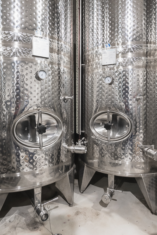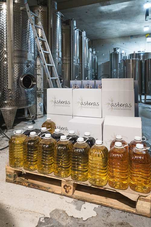 Die Lese war bereits vorbei, die Trauben gepresst und der Traubensaft zur Fermentierung und Reifung in die großen Kessel gepumpt. Daher sah es sehr aufgeräumt aus. In der Halle sahen wir dann auch Gebinde mit dem Namen für deren Hauswein: Asteras.