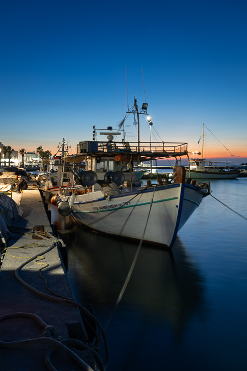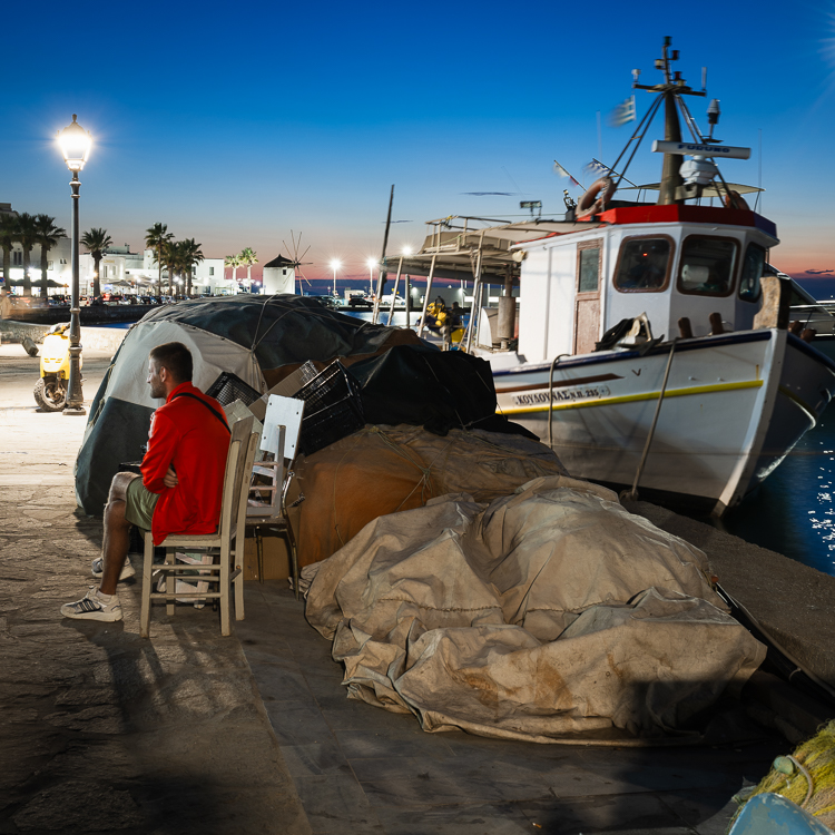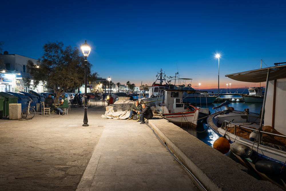 Während die Dämmerung den Himmel über Parikia in weiche Pastelltöne tauchte, verwandelte sich der kleine Hafen in eine Bühne des Alltagslebens. Das Wasser glitzert in goldenen Restlichtern und die Luft riecht nach Salz und Fisch, Öl und Diesel. Zwischen Fischernetzen, Müll und den schaukelnden Booten im Hafenbecken sitzen die Fischer an der Mole – wortkarg, vertraut, mit wettergegerbten Gesichtern.