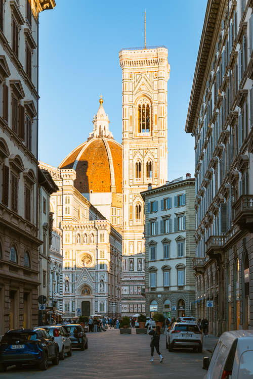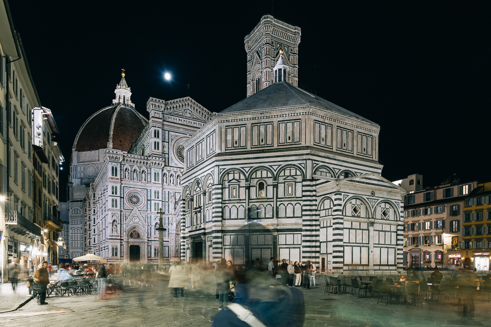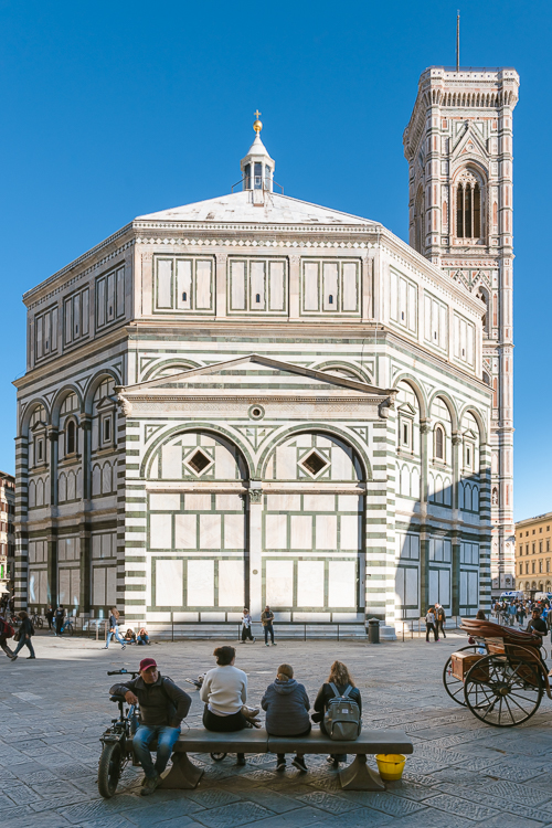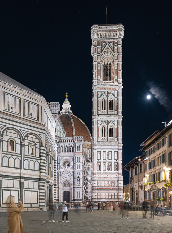 Für meine Reihe der sakralen „Multiperspektiven“ – Collagen wollte ich unbedingt den Dom Santa Maria del Fiore in Florenz fotografieren – er steht historisch wie baugeschichtlich in Beziehung zu den Aufnahmen aus Lucca, Siena und Pisa. Anfang November 2025 hatte ich Zeit, das Wetter sollte Sonne satt, noch herbstliche Temperaturen zwischen 10 Grad nachts und bis zu 20 Grad tagsüber bieten. Auch wenn man dann abends nicht mehr gemütlich auf den Außenterassen der Bars und Restaurants sitzen kann, sind die Temperaturen eher angenehm für ausgedehnte Touren in der Stadt. Mein letzter Aufenthalt vor 15 Jahren fand bei 36 Grad im Sommer statt – tagsüber unerträglich.