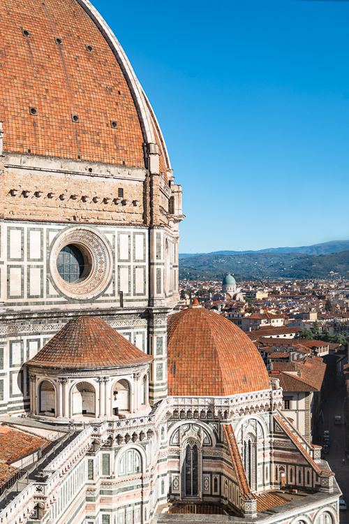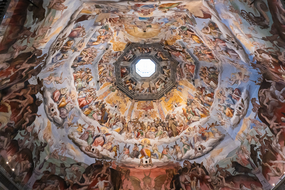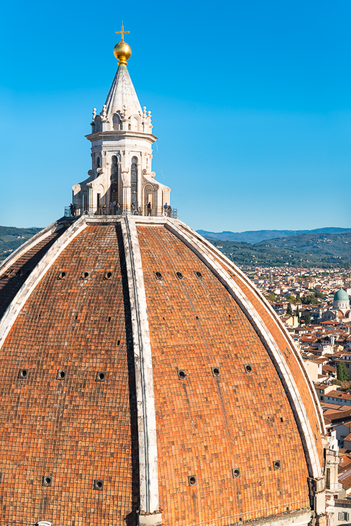 Die Aussichtsterasse des Piazzale Michelangelo auf der anderen Talseite war ein solcher Ort und zeigte, wie der Dom die Silhouette der Stadt dominiert. Ein Aufstieg auf den Campanile empfahl sich, um die Details der Fassade des Kirchenschiffs sowie die darüber hoch aufragende Wölbung der Kuppel aus der Nähe zu Bestaunen. Der Aufstieg auf die Kuppel selbst offenbarte den am nächsten Blick auf das riesige Fresko im Innern sowie im Treppengang innerhalb der zweischaligen Kuppelwände einen Einblick in die meisterliche Bautechnik. Natürlich lohnte allein der Ausblick über die gesamte Stadt schon die über 400 Treppenstufen und 100 Höhenmeter.