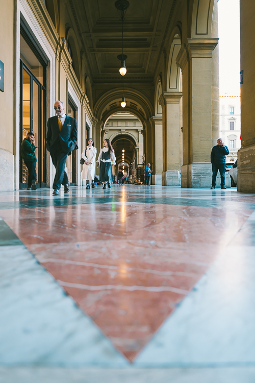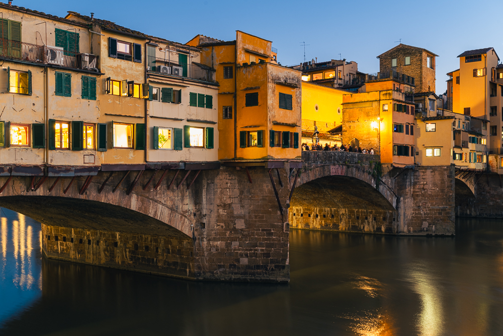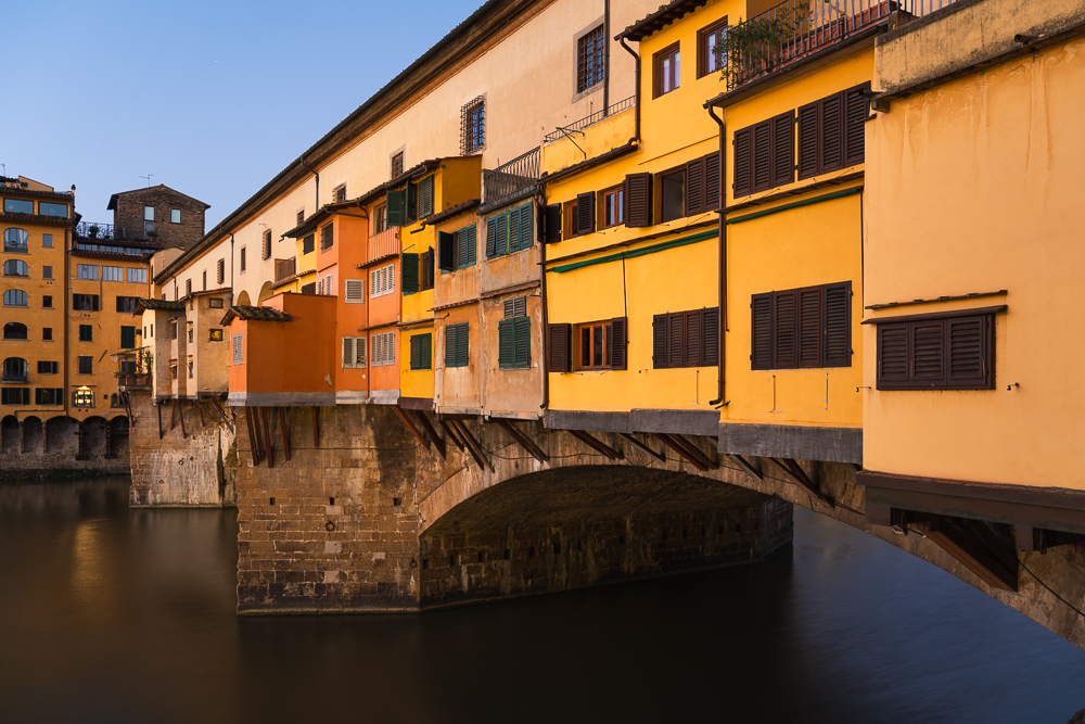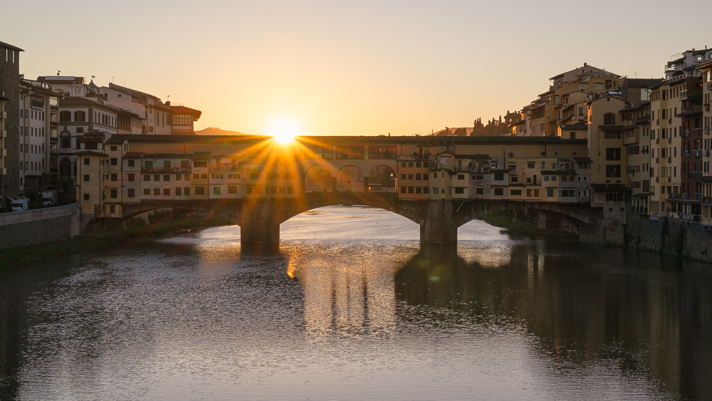 Weiter ging es zur Ponte Vecchio, wo diesmal die meditteranen Farben der östlichen Seite der Brücke in der Dämmerung leuchteten. Mein Ziel war erneut die Santa Trinita Brücke, da zur Zeit meiner Reise die Sonne genau hinter der Ponte Vecchio aufgehen würde. Als schliesslich die Sonne hinter den Hügeln des Chianti hervorkam, kamen auch wieder die professionellen Fotografen mit klassisch in Anzug und Kleid gekleideten Paaren für ihre Honeymoon-Shootings. Personen mit wallenden, bunten Kleidern, wie beim Flying-Dress-Shootings auf Santorini habe ich nicht gesehen.