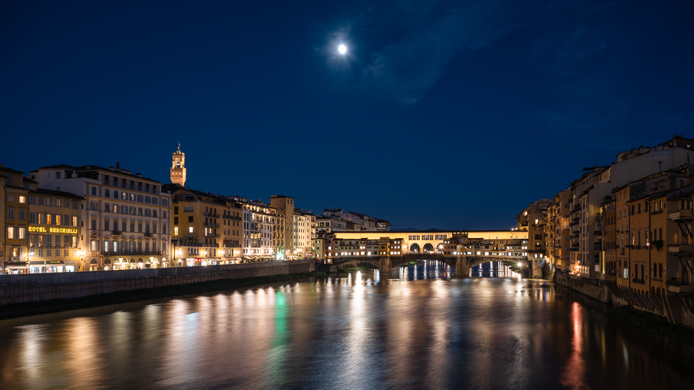 Schliesslich verbrachte ich den frühen Abend mit dem Sonnenuntergang am Flußufer des Arno und dem Blick auf die berühmte „Alte Brücke“ (Ponte Vecchio). Über dem mittelalterlichen Brückenbogen liegen aneinandergereiht kleine Geschäfte, deren Rückseite wie Balkone über die eigentliche Brücke hinausragen. Über die Stockwerke mit den Geschäften verläuft der zuletzt wieder zugänglich gemachte Vasari-Korridor, der den Palazzo Vecchio mit dem Palazo Pitti verbindet.