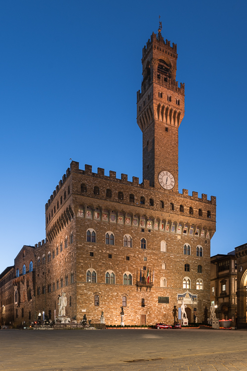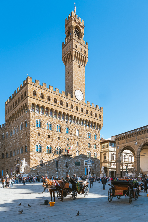 Nach der Erkundung des Doms schlenderte ich durch die Altstadt und zur Piazza della Signoria, dem Wohnzimmer der Stadt und Treffpunkt für Besucher aus aller Welt. Die Proportionen und der Baustil des „Alten Palasts“ mit dem hoch aufragenden Turm begeistert mich jedesmal von neuem. Der architektonische Stil ist – wie beim Dom – eine beeindruckende Mischung aus romanischen, gotischen und Renaissance-Elementen. Auch hier waren wieder einige der berühmtesten Architekten ihrer Zeit tätig, z.B. Arnolfo di Cambio, Michelozzo di Bartolomeo und Giorgio Vasari.