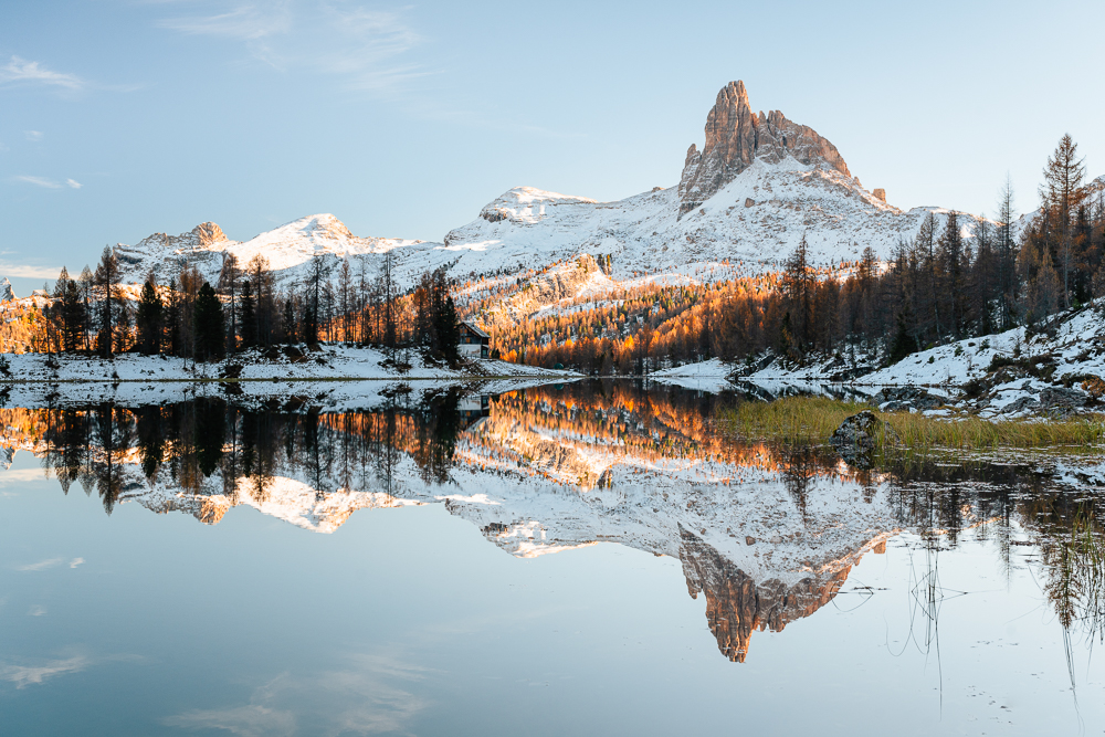 Auf dem Rückweg von der Reise nach Florenz hing ich noch einen Aufenthalt in den herbstlichen Dolomiten an. Für den Besuch am Federa-See bei Cortina d’Ampezzo war ich eigentlich zwei Wochen zu spät: der Höhepunkt der gelb-goldenen Färbung der Lärchen war in diesen Bergregionen schon vorbei. Die Bäume warfen bereits die Nadeln ab und auch die Nächte wurden zum Übernachten im Dachzelt schon sehr frostig. Das ist trotz gutem Daunenschlafsack und Isolierung dennoch unbequem und kostet mich immer eine große Überwindung. Da es die Tage zuvor geschneit hatte, wurde mit den schneebedeckten höheren Bergregionen bereits der Übergang zum Winter verdeutlicht.